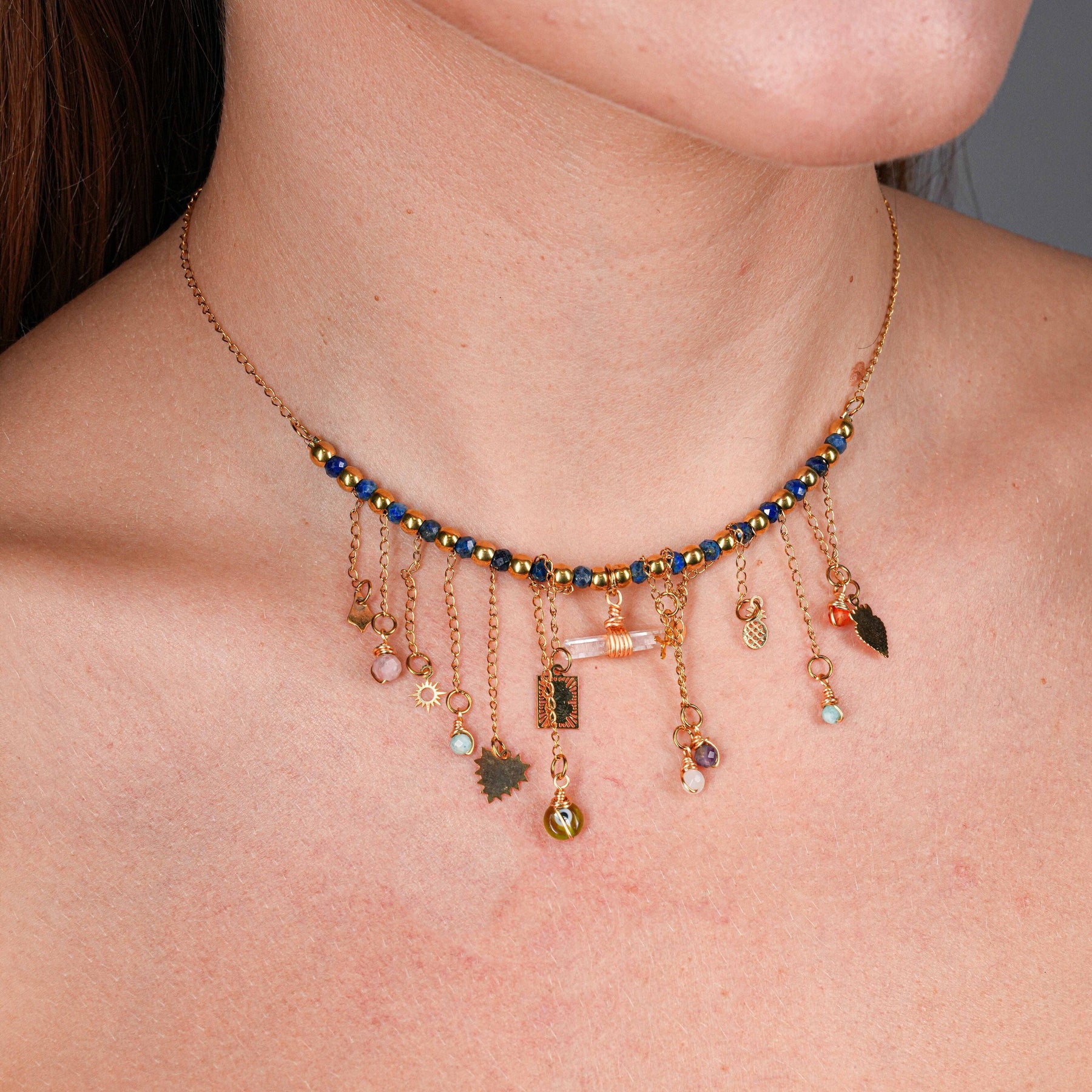 NAM010 Collana in acciaio chirurgico dorato pendenti, cristalli e pendenti