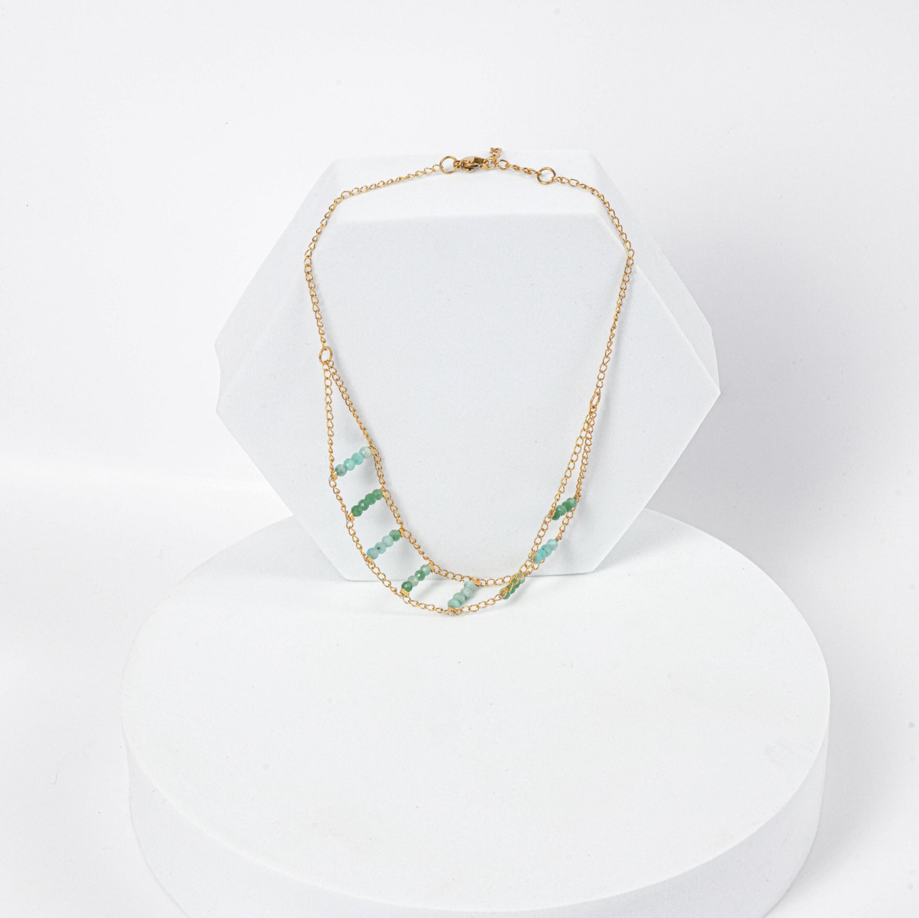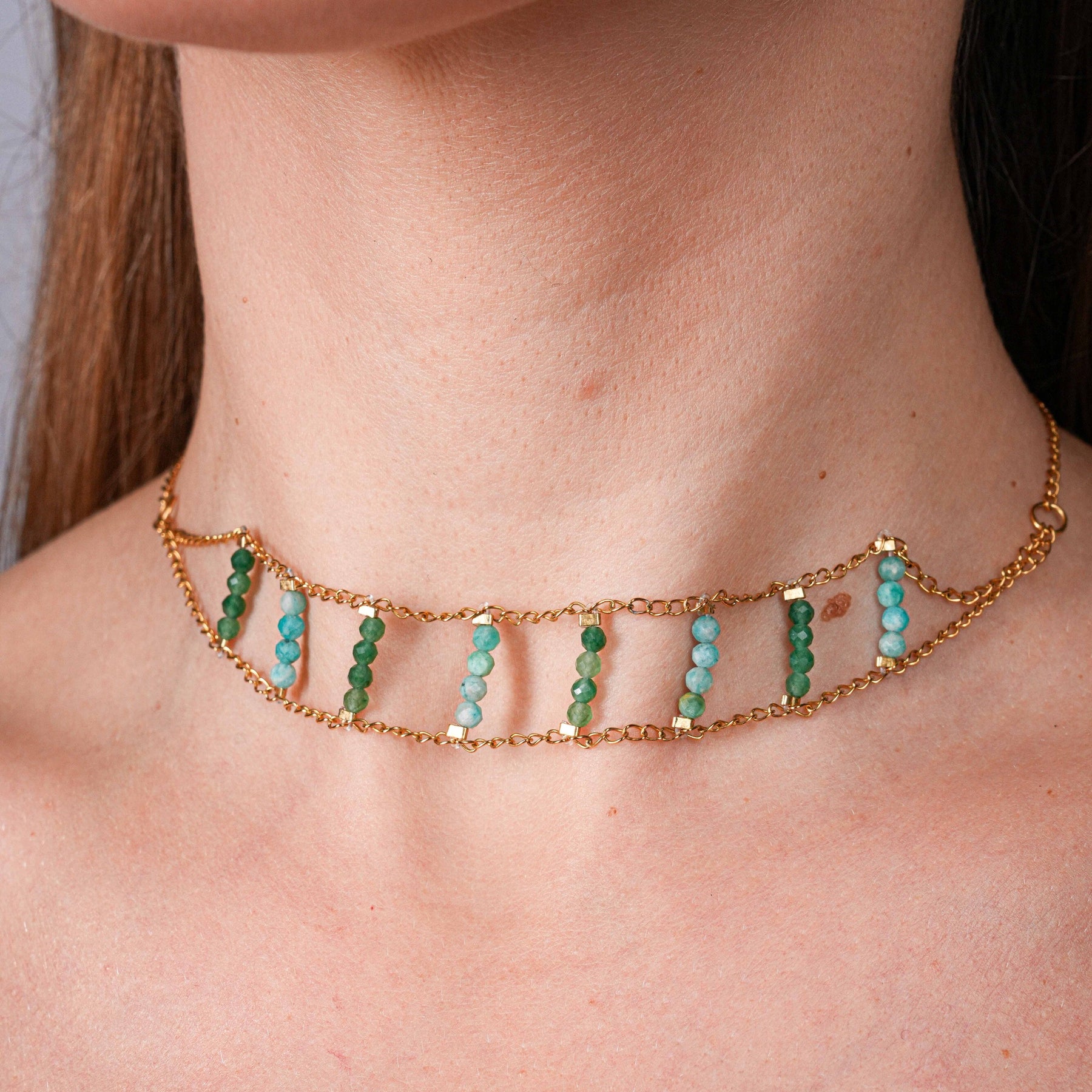 NAM005 Collana choker in acciaio chirurgico dorato con avventurina e amazzonite