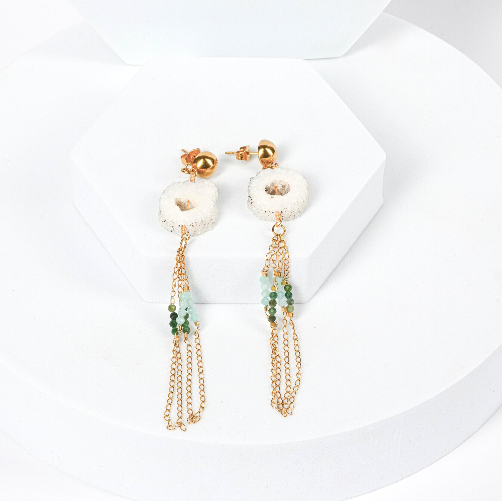 NAM019 Orecchino in acciaio chirurgico dorato con geode di quarzo e amazzonite