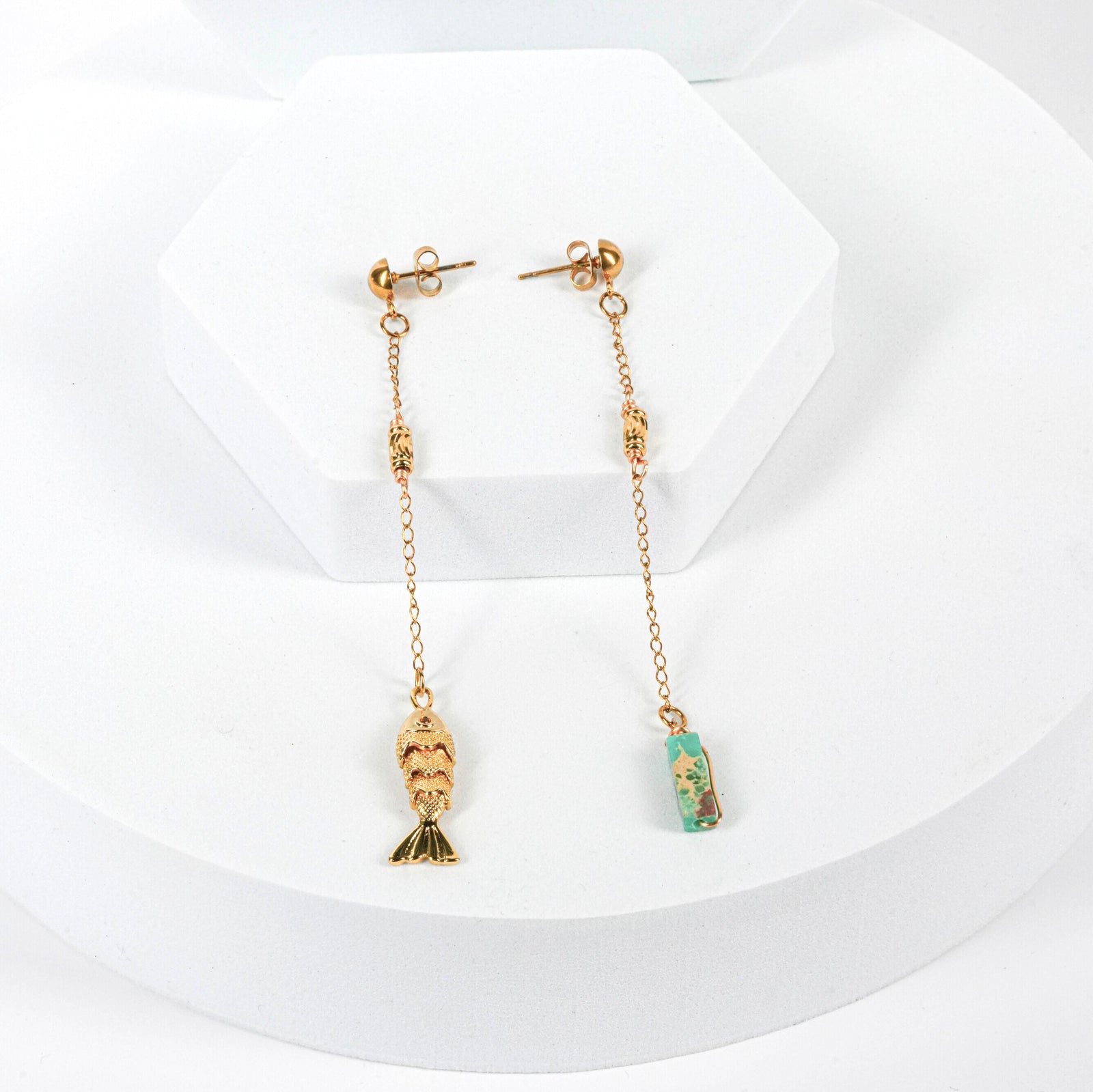 NAM018 Orecchino in acciaio chirurgico dorato con pendente pesce e turchese
