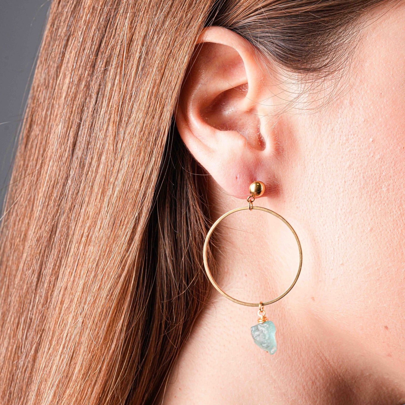 NAM016 Orecchino in acciaio chirurgico dorato cerchio con acquamarina grezza